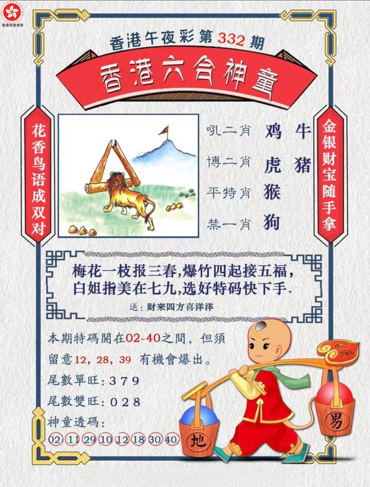 | 330期:⑨肖 | 猪羊虎马鼠牛猴狗鸡 | 开:虎40 |